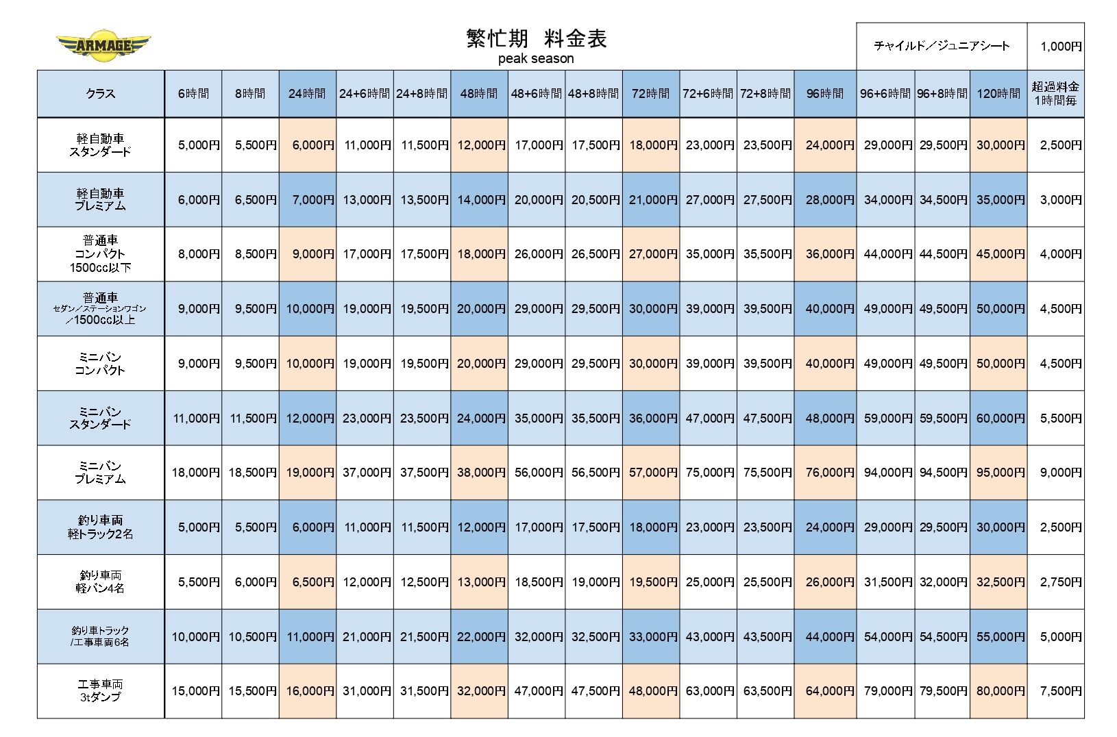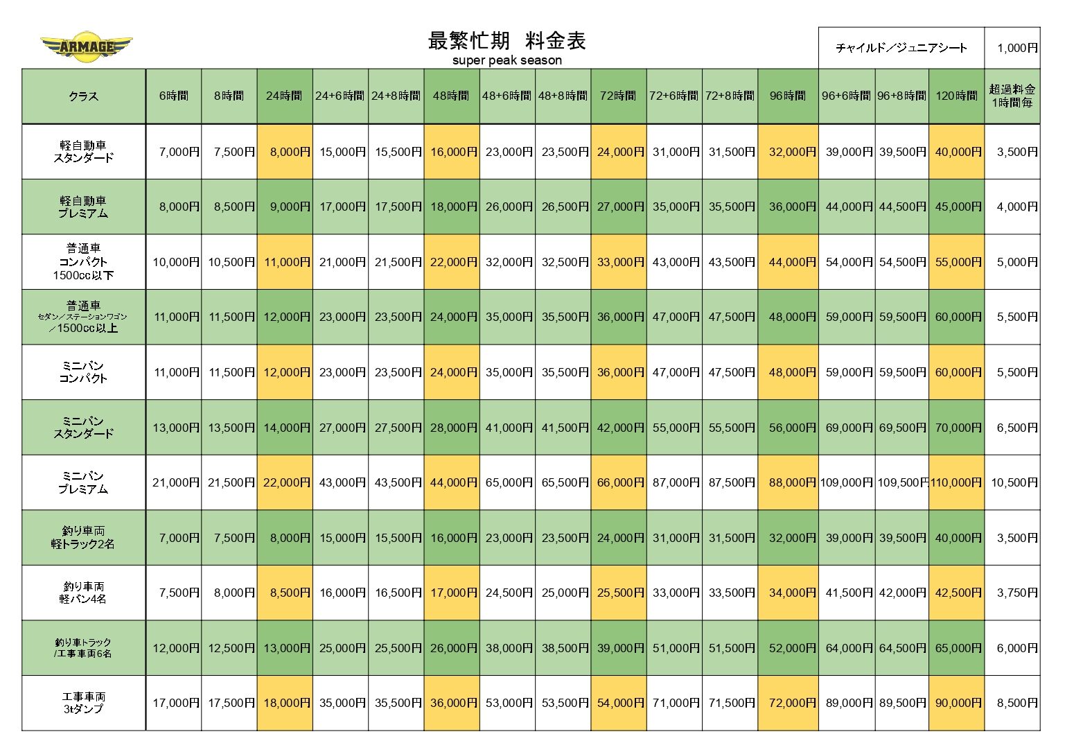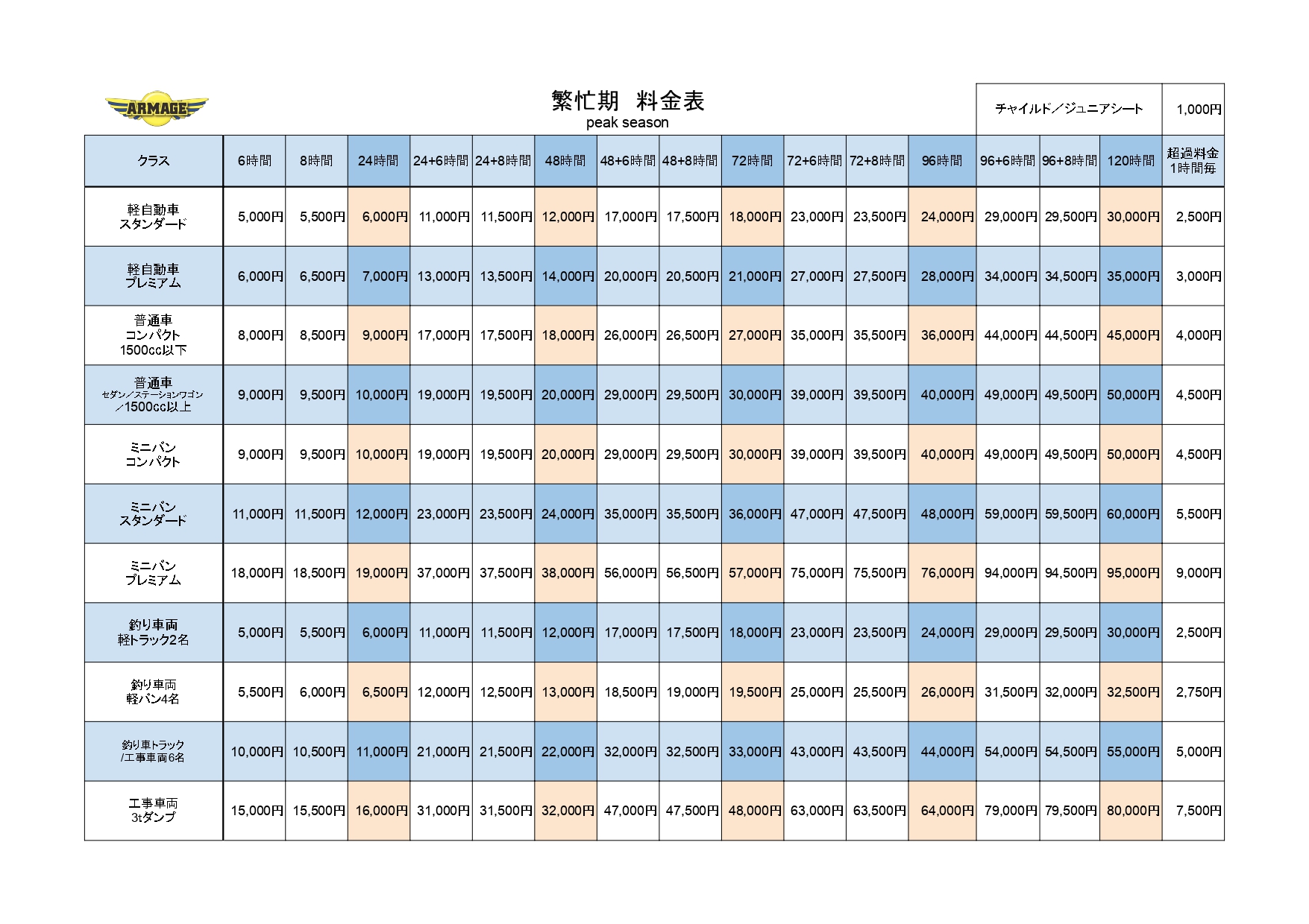 期間が重複している日程(例:夏季シーズン中の8月7日〜16日など)につきましては、「最繁忙期料金」が優先して適用されます。あらかじめご了承ください。