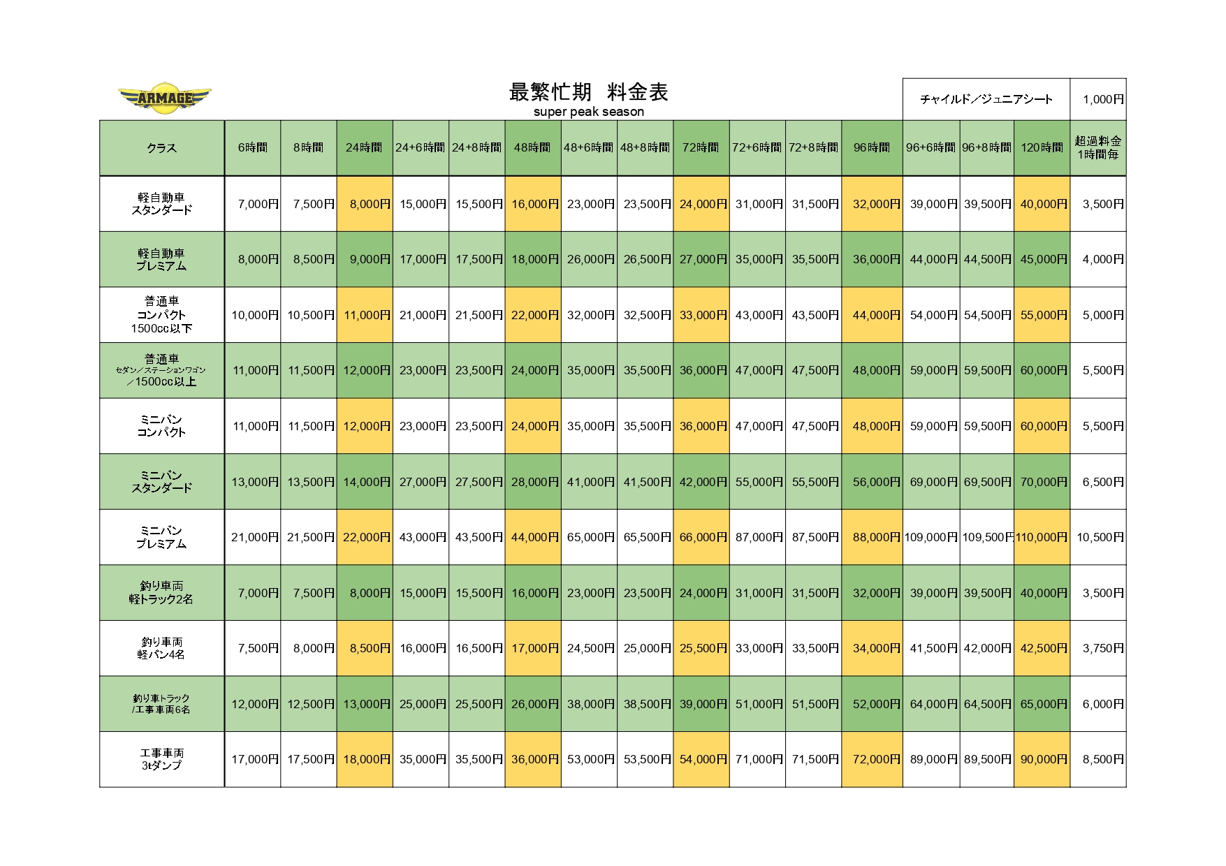 ・「超過料金」は、貸渡契約時間後に発生した場合の料金です。